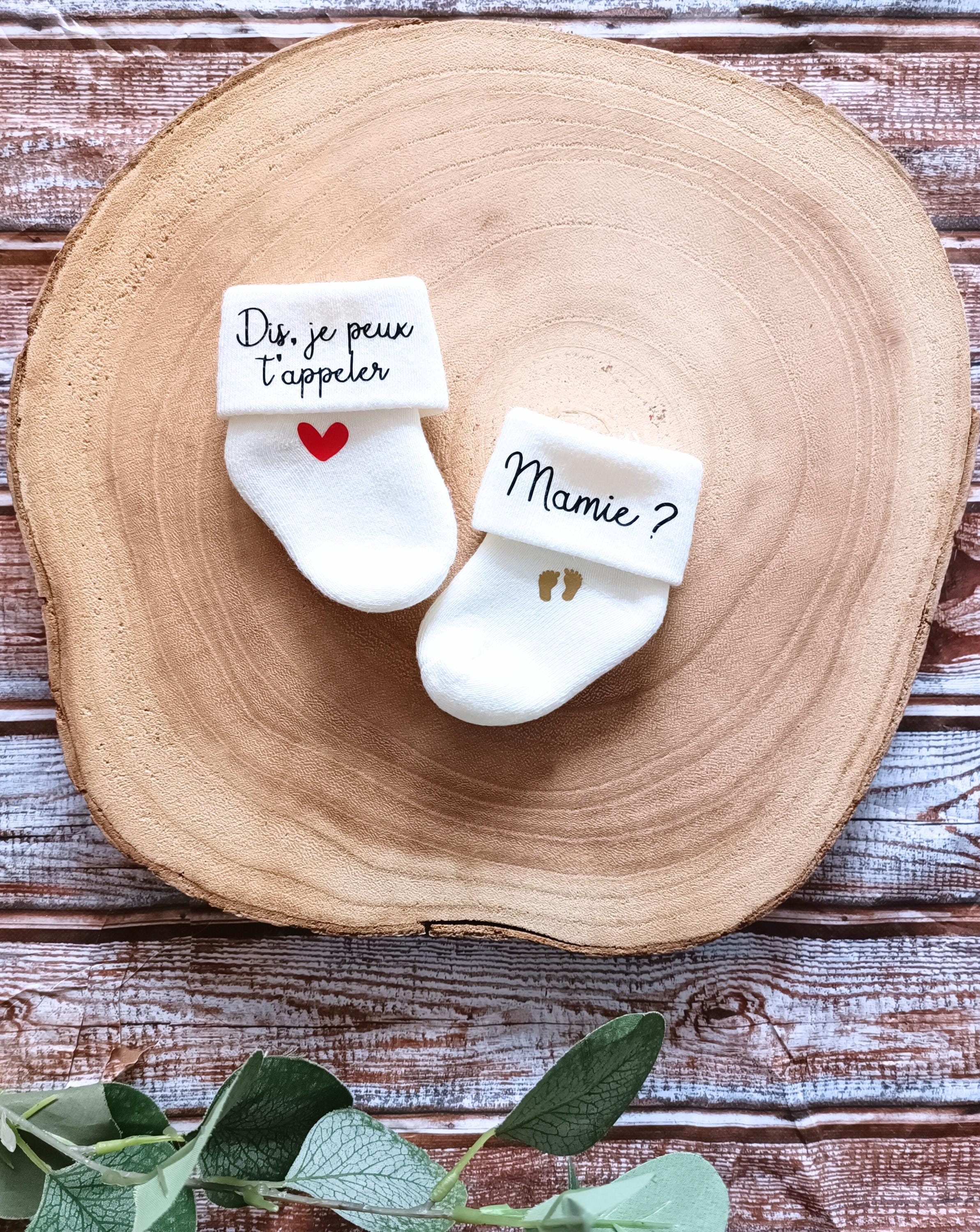 CHAUSSETTES PERSONNALISABLES POUR BEBE ET POUR ANNONCE DE GROSSESSE A LA FAMILLE - THEME DIS JE PEUX...